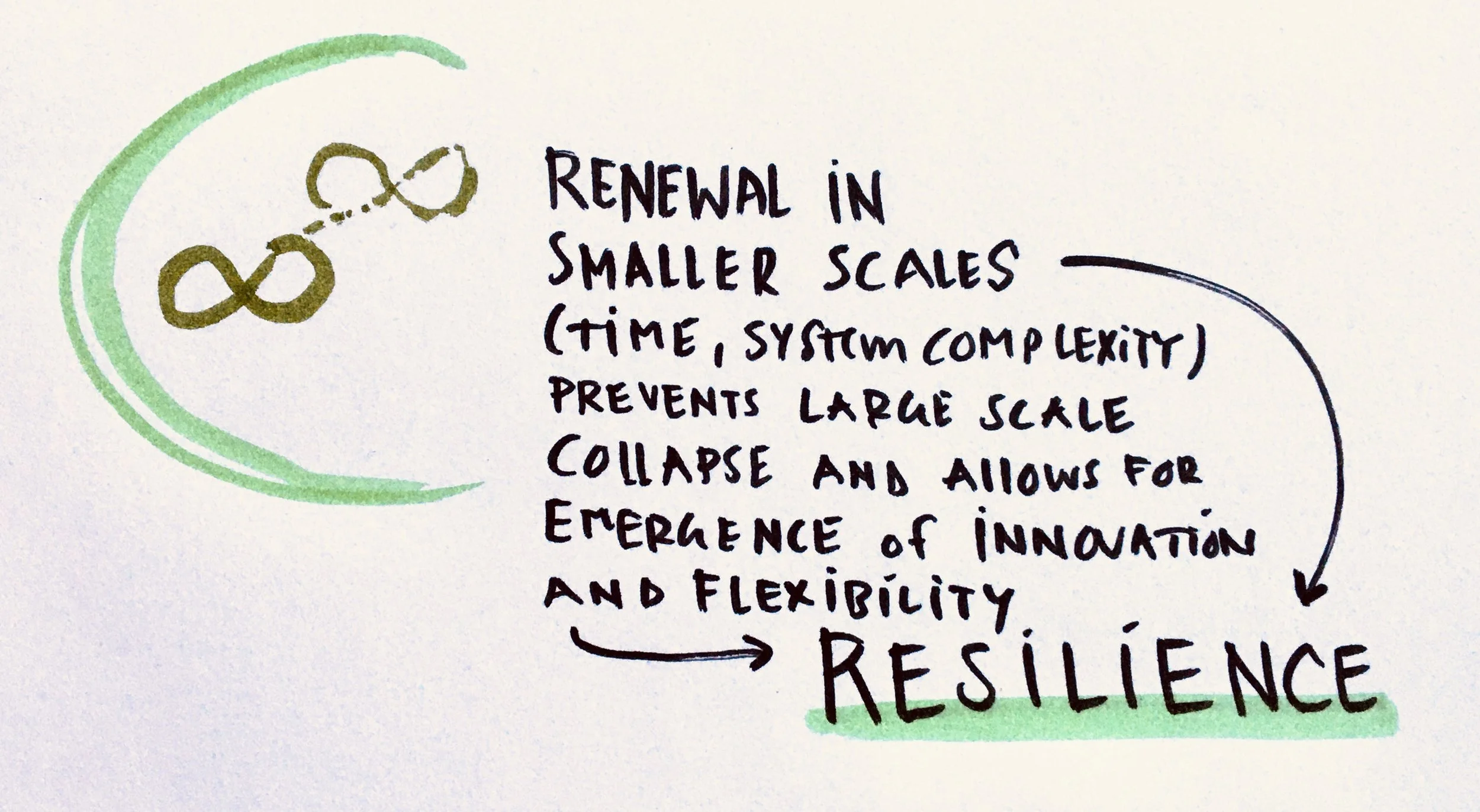 On an economic and societal level artificial and constant growth neglects this natural rhythm of falling apart and reassembling. I love Buzz Holling’s Adaptive Cycle of Ecosystems for this as a metaphor for how we go through phases in our lives – depression, ideation, the beginning of a dream or project, its flourishing, its letting go and the falling apart. This cycle of re.organizing, growing, conserving (or maturing) and letting go and falling apart can happen be found on a daily, weekly, annual, multi-generational basis…